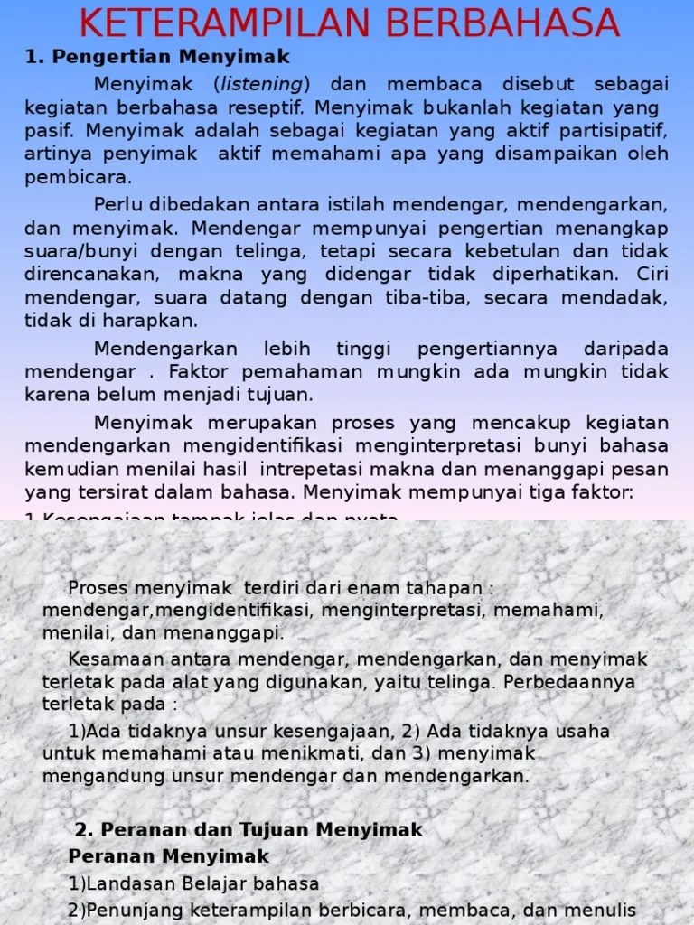 Peranan Keterampilan Menyimak - Menyimak Hakikat Menyimak Proses Menyimak Faktor Pemengaruh Upaya : Pembelajaran b ahasa indonesia memiliki peranan y ang sangat penting bukan.. Maka dengan demikian, menyimak bermakna mendengarkan dengan penuh b. Cukup dengan menyimak artikel ini saja secara santai, maka anda sudah bisa memperdalam pelajaran bahasa pemrograman! Dari keempat keterampilan berbahasa (menyimak, membaca, berbicara, dan menulis), manakah yang perlu mendapat perhatian lebih dalam suatu pembelajaran bahasa indonesia di sekolah dasar (sd). Jelaslah betapa pentingnya faktor peranan dalam masyarakat bagi peningkatan menyimak.kendala yang. Keterampilan menyimak pada dasarnya adalah keterampilan mendengarkan dengan penuh perhatian dan pemahaman untuk.